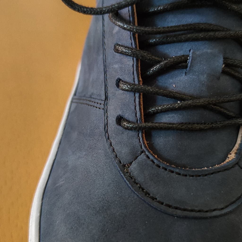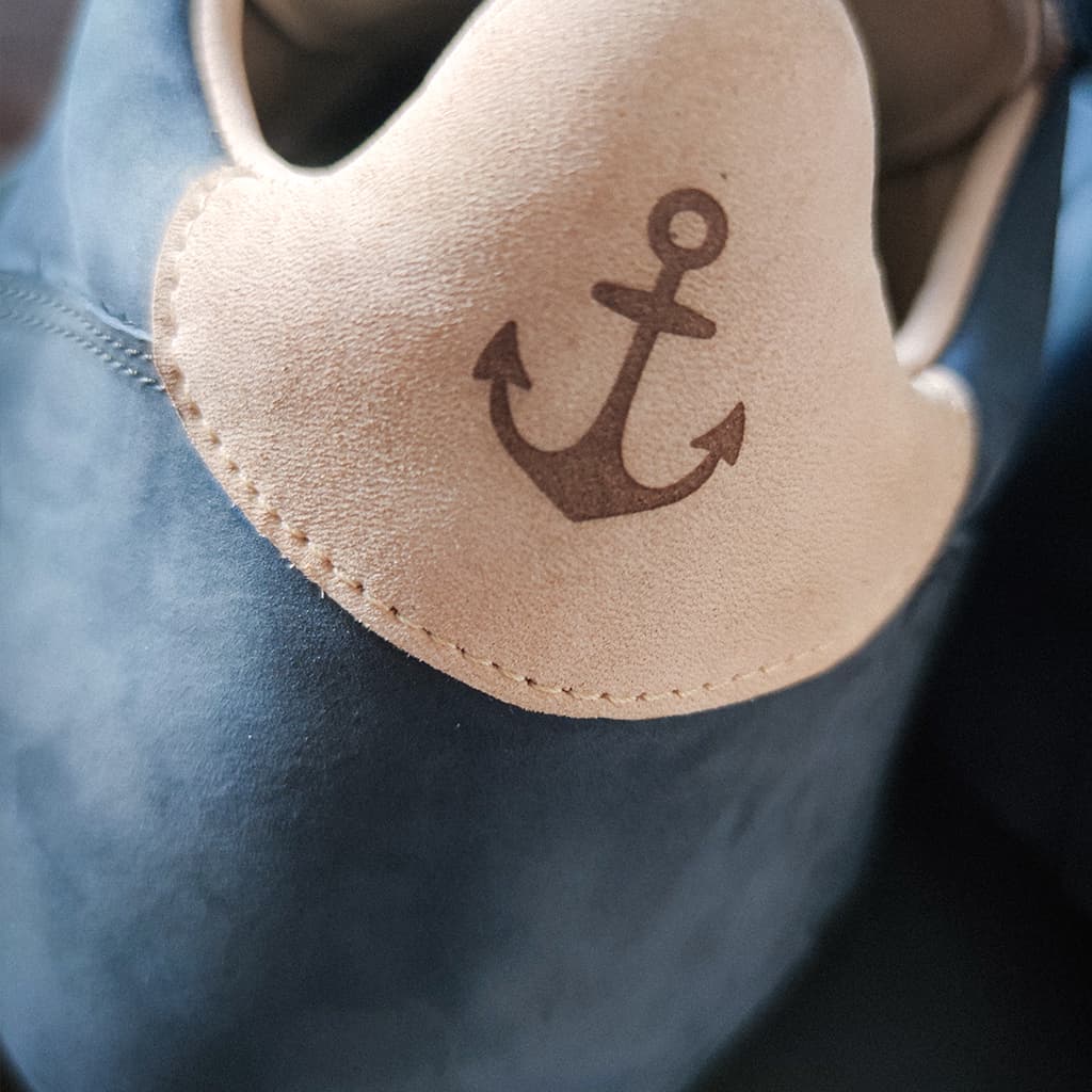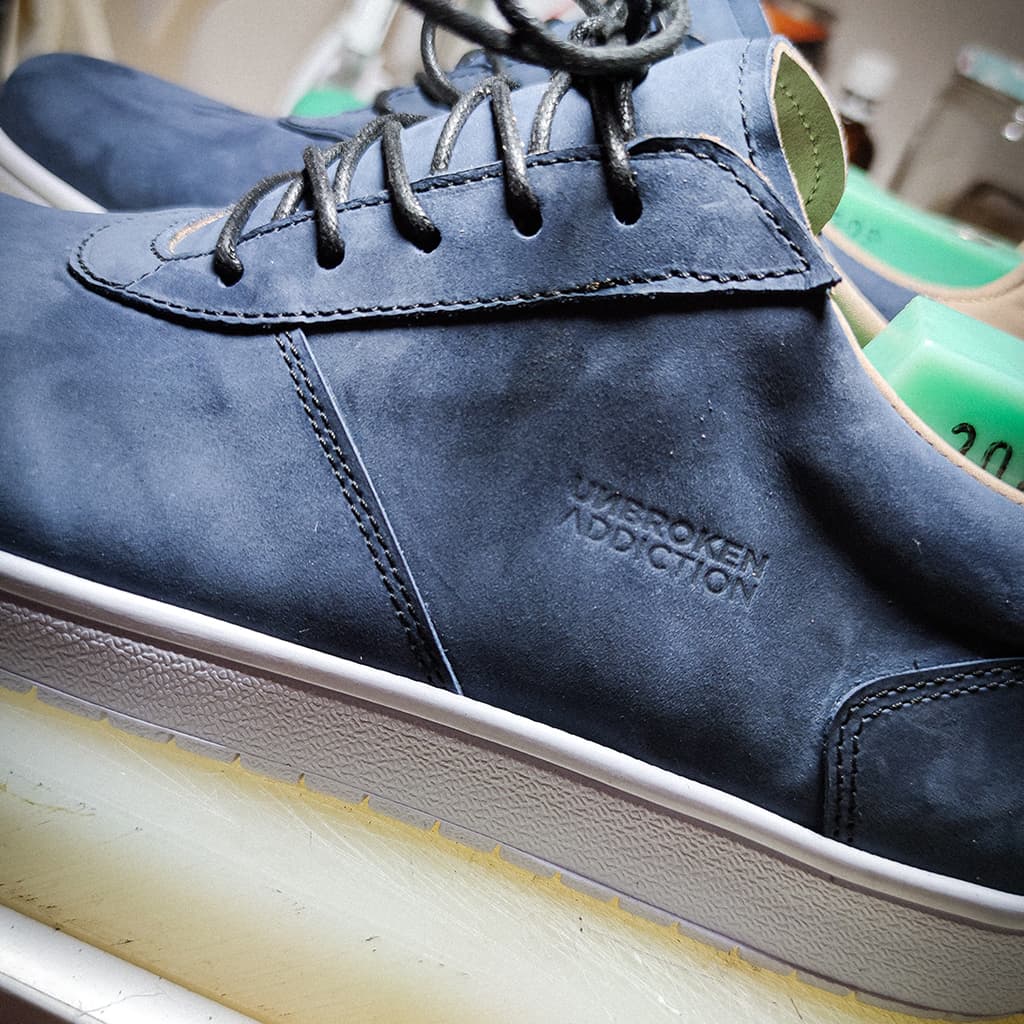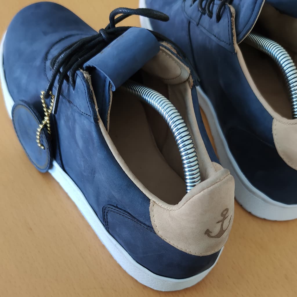 Tyto boty byly vyrobené jako dárek pro klienta který miluje moře. Proto byla zvolena námořní modrá hovězí úseň. Jako detail celé tenisky je kotva v zadní části boty, která je přímo vylaserována do kůže.