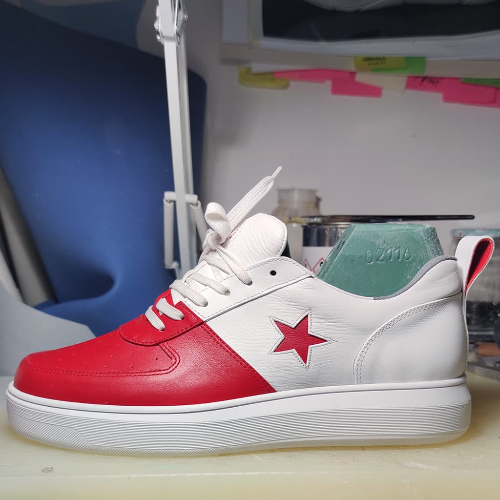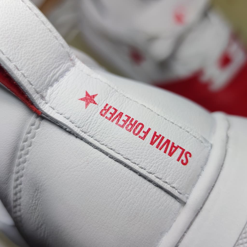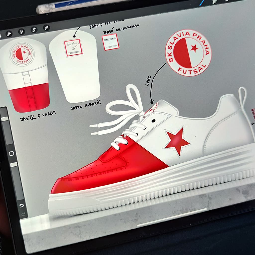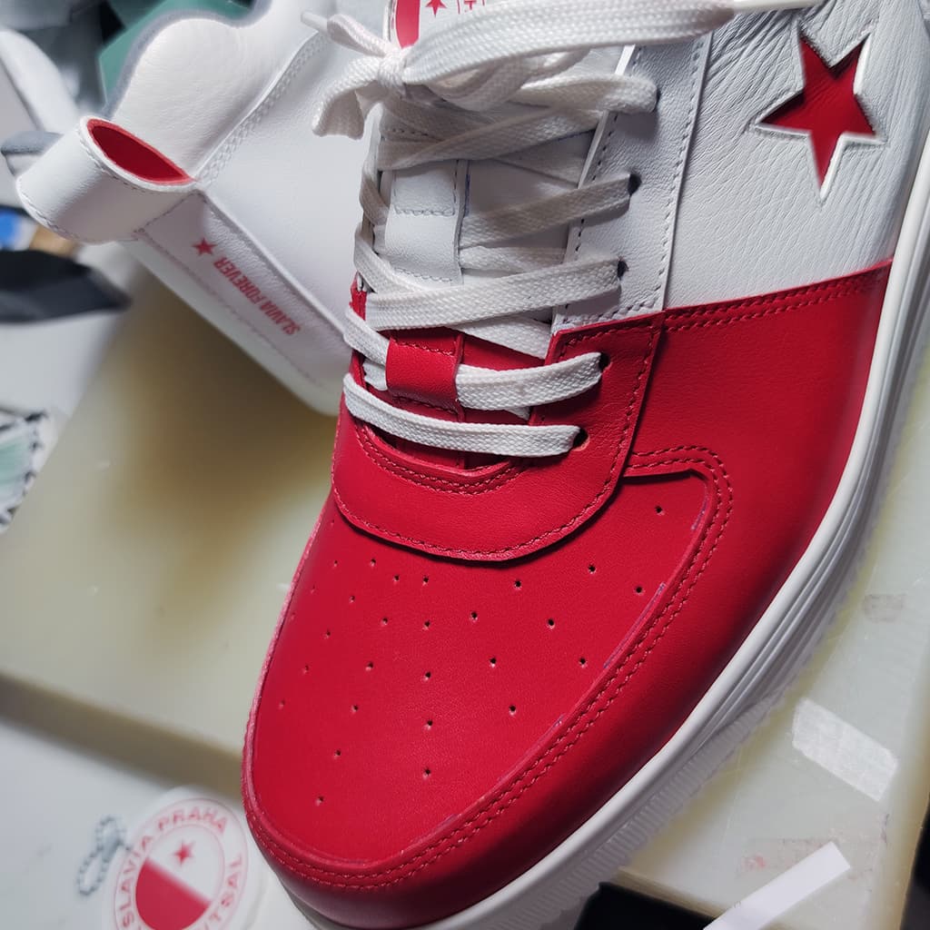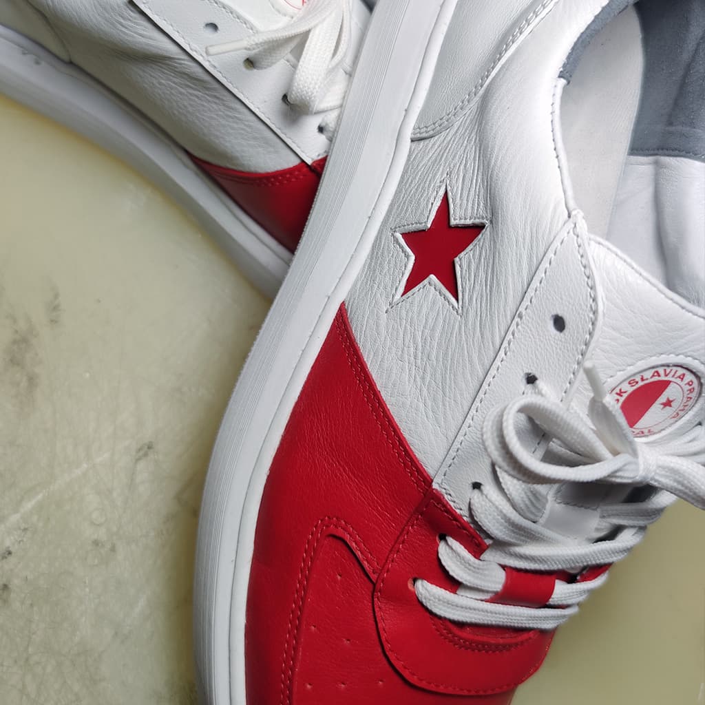Bílá a červená. Tenisky inspirované barvami futsálového klubu SK Slavia Praha.