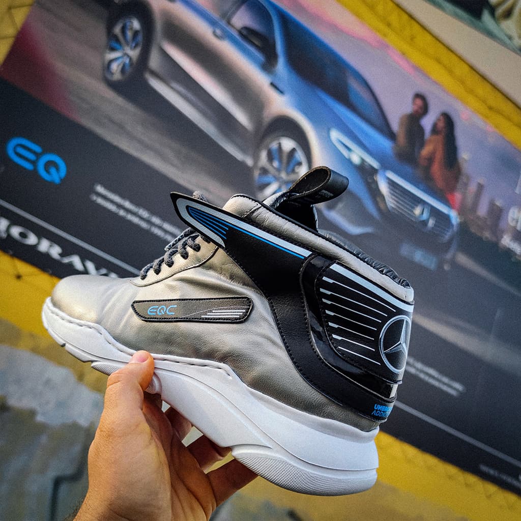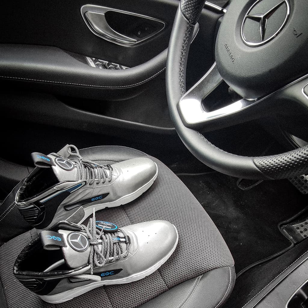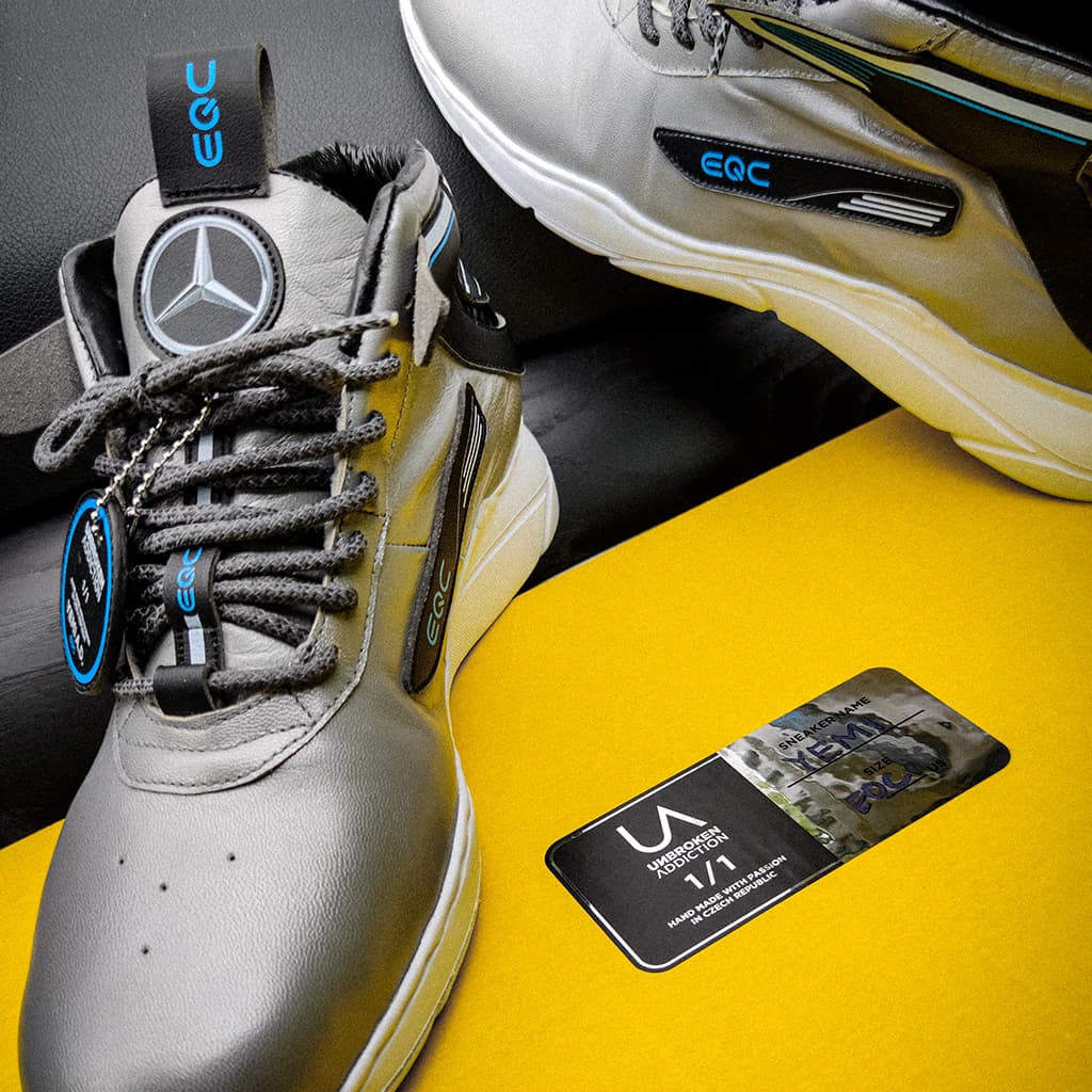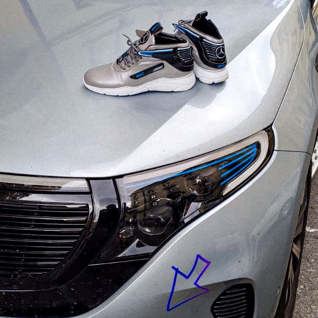 Tvar zadní části tenisek vychází z designu přední části vozu Mercedes-Benz EQC. Barvy jednotlivých dílů tenisek jsou voleny tak, aby se co nejvíce přiblížily celkovému designu auta. Tyto tenisky byly vyrobeny pro YEMI A.D. (Multi-disciplinary creative).